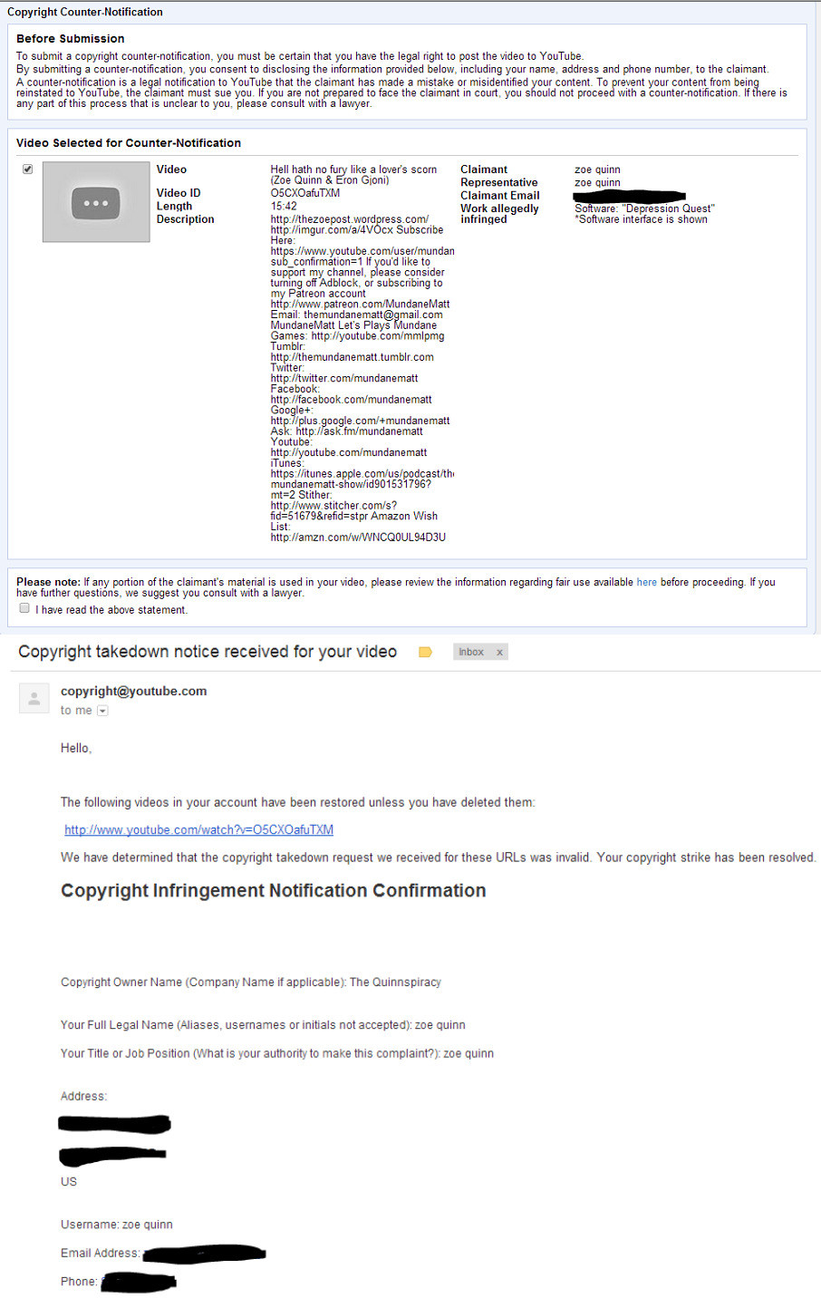 In the video, a static image appears in the background from Quinn’s game Depression Quest. The same image that was used in Graysons Admission Quest article, and was a promoted screen shot on Steam and the official games website. Quinn issues a Digital Millennium Copyright Act takedown notice on the video, alleging copyright infringement due to the use of a static screenshot. The video is taken down by Google and YouTube. [12]